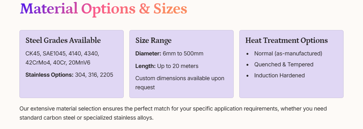 Precision & Motion Stability: Ultra-low surface roughness (Ra≤0.1μm for high-end models) and excellent straightness minimize friction with seals, bearings, and guide sleeves, reducing system energy consumption by 10-15% and ensuring smooth motion even at high speeds (up to 5m/s).