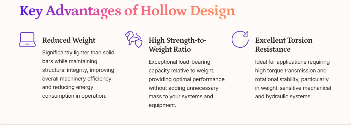 Lightweight & High Strength: Hollow structure reduces weight by 30-50% vs. solid chrome plated rods, optimizing equipment energy efficiency without compromising mechanical performance (yield strength ≥355MPa for standard materials). Ideal for portable machinery and aerospace applications with weight constraints.
