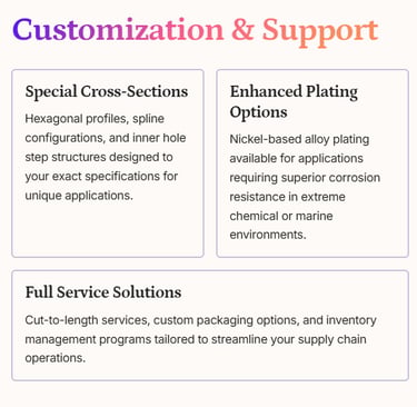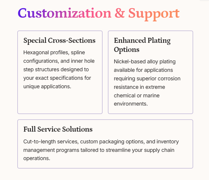 Comprehensive quality verification including salt spray testing (ASTM B117), hardness measurement, dimensional accuracy checks, and ultrasonic flaw detection.