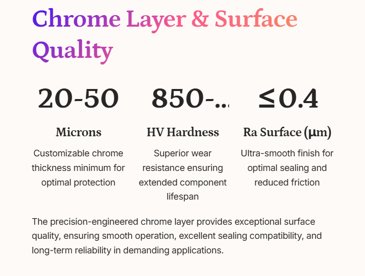 Easy Installation & Maintenance: Oxide-free surface and precise dimensional tolerance allow direct assembly with cylinders, flanges, and bearings—eliminating secondary processing. The smooth chrome surface reduces contaminant adhesion, lowering maintenance frequency by 40%.