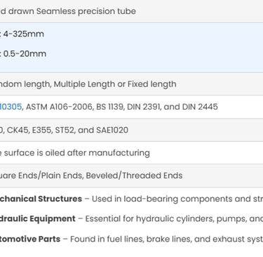Essential for high-pressure hydraulic and pneumatic components, these tubes maintain tight tolerances and low friction to ensure reliable fluid flow. Their accuracy and strength make them suitable for demanding applications, including hydraulic cylinders, pneumatic actuators, and industrial fluid systems.